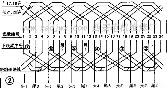 先取下第一個(gè)同心式繞組兩槽。然后空兩槽取下第二個(gè)繞組兩槽。注意這兩組線圈都只取下一個(gè)有效邊。取完后把這兩組未入槽的4個(gè)有效邊,用絕緣紙包好懸置。然后空兩槽下第三組,這時(shí)繞組的兩個(gè)有效邊都要下入線槽。照此方法下好第四、第五個(gè)繞組。取下第六個(gè)繞組時(shí),需將第一、第二繞組懸置部分朝相反方向翻轉(zhuǎn),顯露出第六個(gè)繞組的線槽,將第六個(gè)繞組取完,最后依次取好第一、第二繞組的懸置的有效邊(見圖2)。
